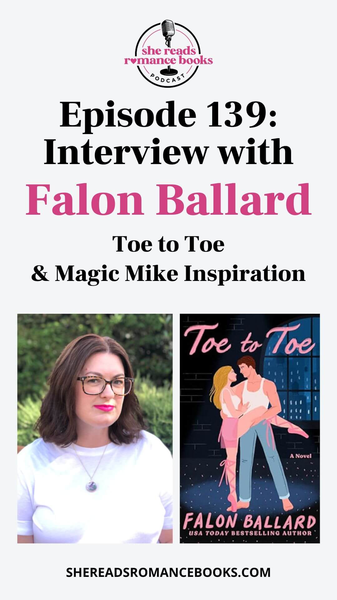Check out the She Reads Romance Books Podcast interview with Falon Ballard as they discuss her new romance book release, Toe to Toe and Magic Mike inspiration!